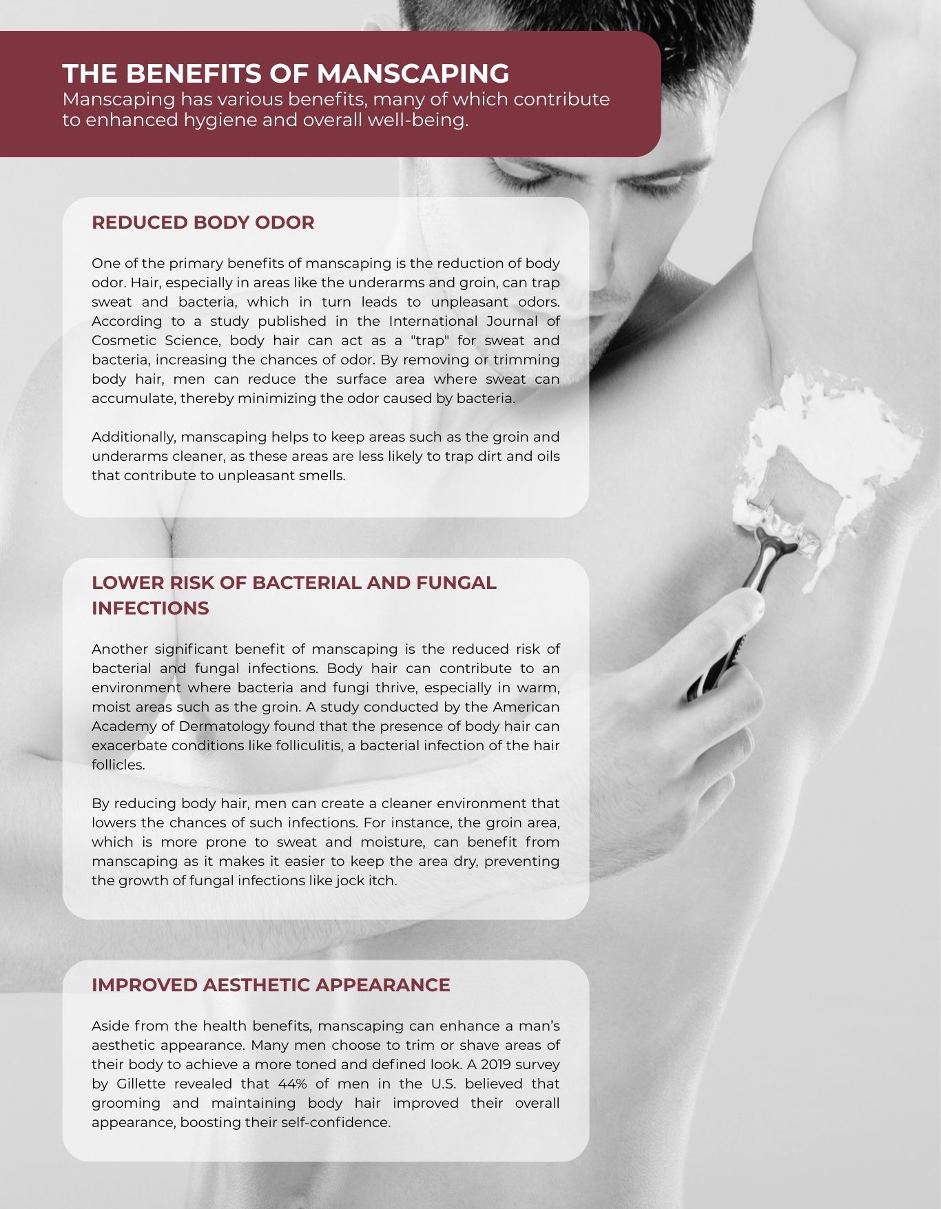 As grooming trends have shifted, manscaping has evolved from a niche practice to a common part of men’s self-care routines. According to a 2020 survey by Harris Poll, 67% of men reported regularly trimming or shaving their body hair, and 45% of them do so for hygienic reasons.